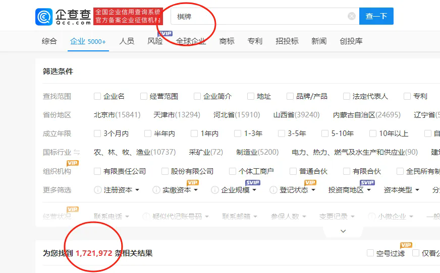 据企查查相关搜索数据显示,截止至2024年8月,中国注册的棋牌室数量已高达172万家以上。这一庞大的数字不仅反映了棋牌室行业的繁荣,也体现了消费者对于休闲娱乐需求的日益增长。