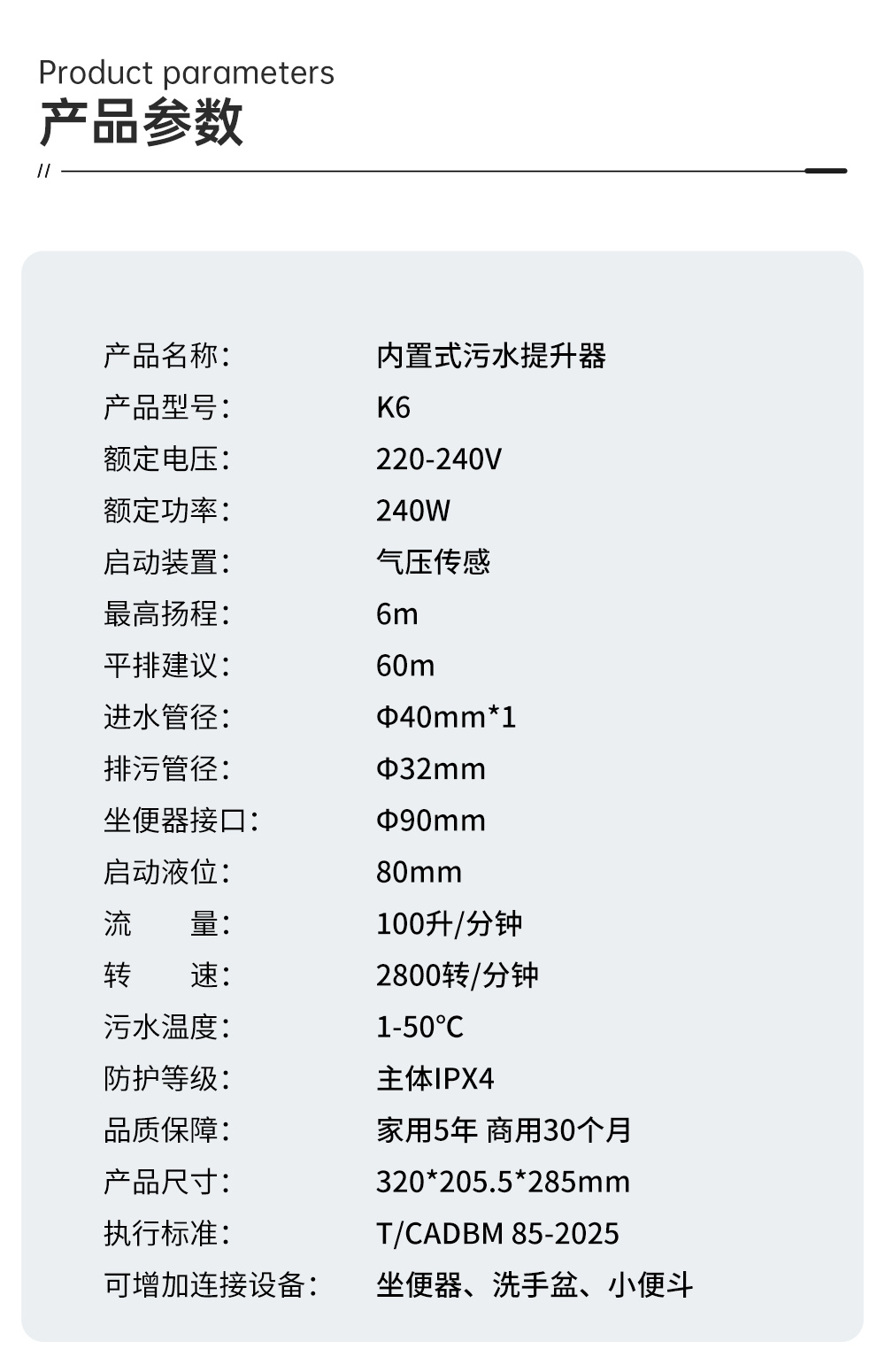 低能耗、高扬程、寿命长、360°强劲自洁 强劲铰刀、自动排污,适配提升排水坐便器