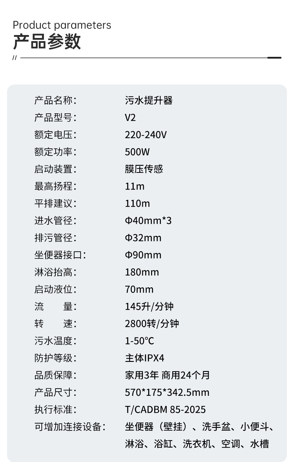 高扬程,耐油污,便捷维护,适合壁挂坐便器 无需重装排污系统,随意增建厨卫空间