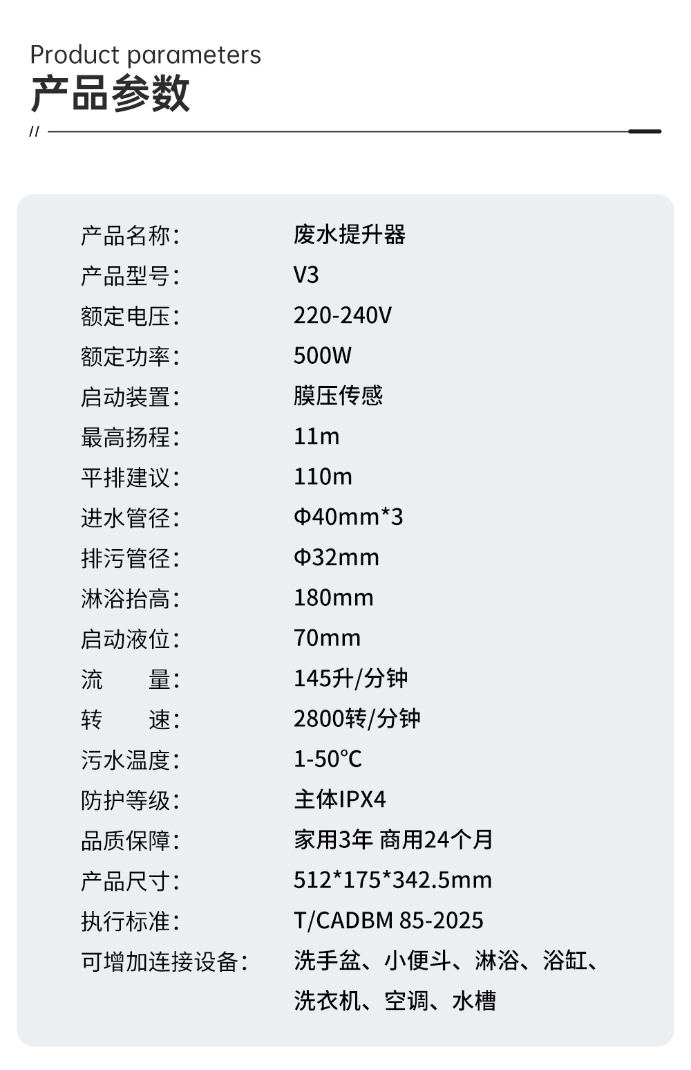 高扬程,耐油污,便捷维护,纯排废水 无需重装排污系统,随意增建厨卫空间